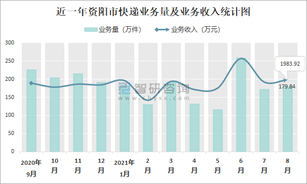 近一年資陽市快遞業務量及業務收入統計圖