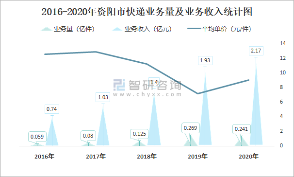 2016-2020年資陽市快遞業務量及業務收入統計圖