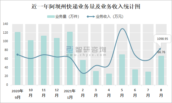 2021年8月阿壩州快遞業(yè)務量與業(yè)務收入分別為66.76萬件和1098.95萬元