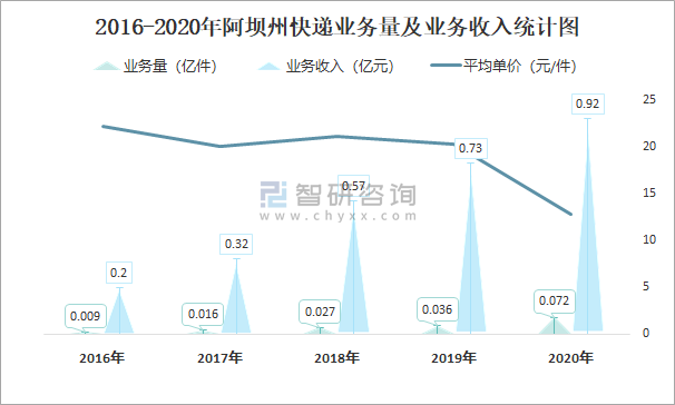 2016-2020年阿壩州快遞業(yè)務量及業(yè)務收入統(tǒng)計圖