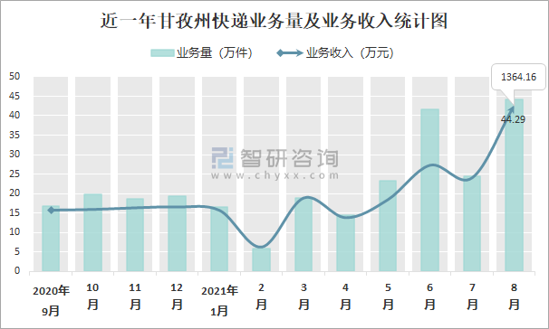 2021年8月甘孜州快遞業(yè)務(wù)量與業(yè)務(wù)收入分別為44.29萬(wàn)件和1364.16萬(wàn)元
