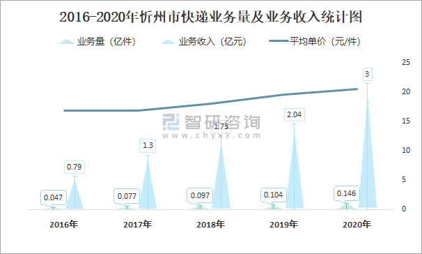 2016-2020年忻州市快遞業務量及業務收入統計圖