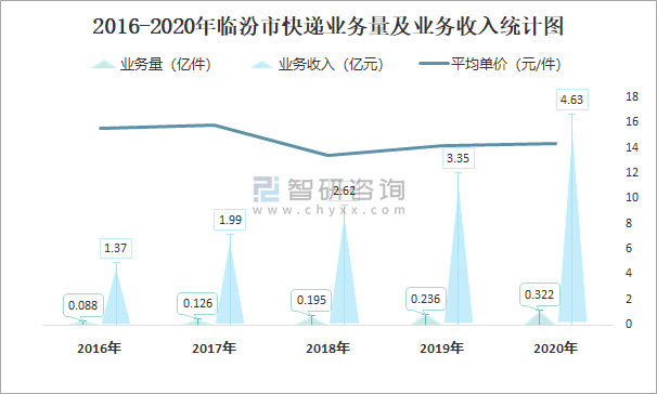 2016-2020年臨汾市快遞業(yè)務(wù)量及業(yè)務(wù)收入統(tǒng)計(jì)圖