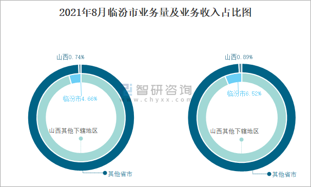 2021年8月臨汾市業(yè)務(wù)量及業(yè)務(wù)收入占比圖