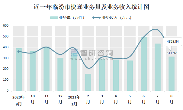 近一年臨汾市快遞業(yè)務(wù)量及業(yè)務(wù)收入統(tǒng)計(jì)圖