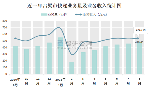 近一年呂梁市快遞業務量及業務收入統計圖