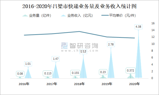 2016-2020年呂梁市快遞業務量及業務收入統計圖