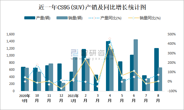 近一年CS95(SUV)產(chǎn)銷及同比增長統(tǒng)計圖