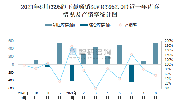 2021年8月CS95旗下最暢銷SUV(CS952.0T)近一年庫存情況及產(chǎn)銷率統(tǒng)計圖