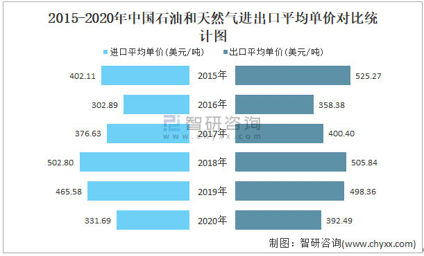 2015-2020年中國石油和天然氣進出口平均單價對比統計圖