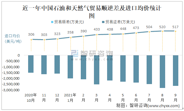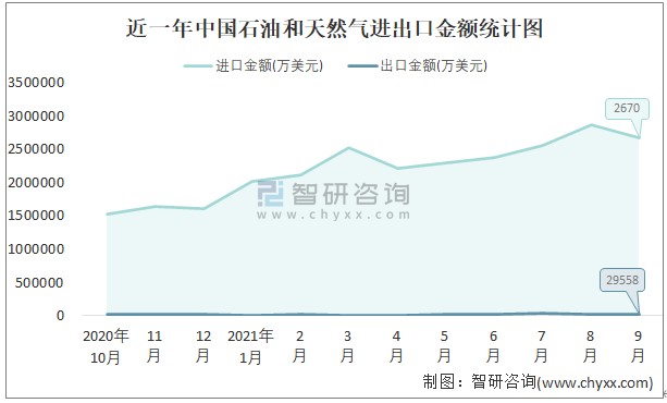 根據中國石油和化學工業聯合會數據顯示:2021年9月中國石油和天然氣進口數量為5168.8萬噸,出口數量為59.3萬噸;進口金額為2670048萬美元,出口金額為29558萬美元;近一年中國石油和天然氣出口總金額小于進口總金額,貿易逆差為主,進口均價517美元/噸。