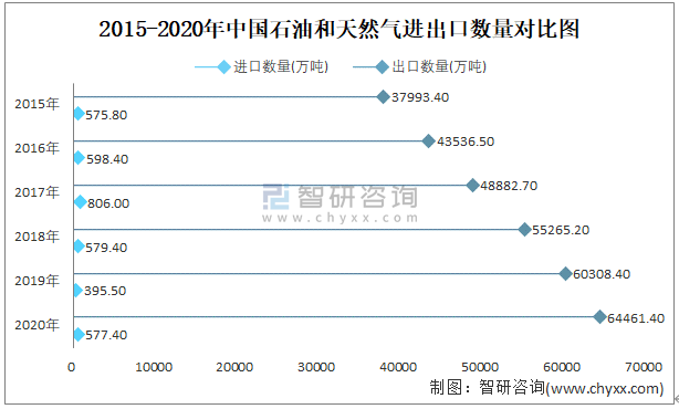 2015-2020年中國石油和天然氣進出口數量對比統計圖