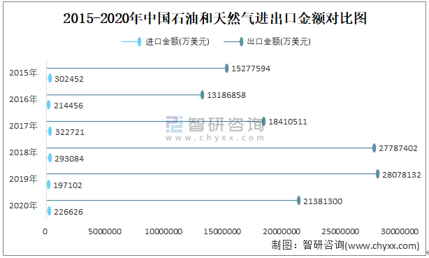 2015-2020年中國石油和天然氣進出口金額對比統計圖