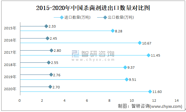 2015-2020年中國殺菌劑進出口數量對比統計圖