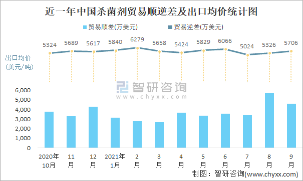 根據中國石油和化學工業聯合會數據顯示:2021年9月中國殺菌劑進口數量為0.1萬噸,出口數量為1.2萬噸;進口金額為2234萬美元,出口金額為6847萬美元;近一年中國殺菌劑出口總金額大于進口總金額,貿易順差為主,出口均價5706美元/噸。