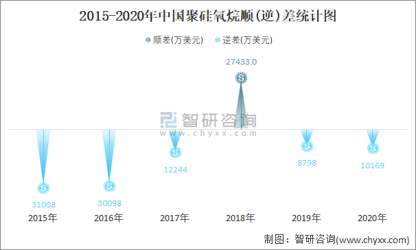 2015-2020年中國(guó)聚硅氧烷順(逆)差統(tǒng)計(jì)圖