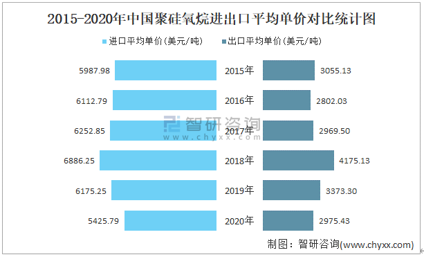 2015-2020年中國(guó)聚硅氧烷進(jìn)出口平均單價(jià)對(duì)比統(tǒng)計(jì)圖