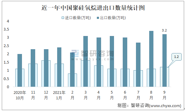 根據(jù)中國(guó)石油和化學(xué)工業(yè)聯(lián)合會(huì)數(shù)據(jù)顯示:2021年9月中國(guó)聚硅氧烷進(jìn)口數(shù)量為1.2萬(wàn)噸,出口數(shù)量為3.2萬(wàn)噸;進(jìn)口金額為8516萬(wàn)美元,出口金額為12537萬(wàn)美元;近一年中國(guó)聚硅氧烷出口總金額大于進(jìn)口總金額,貿(mào)易順差為主,出口均價(jià)3918美元/噸。