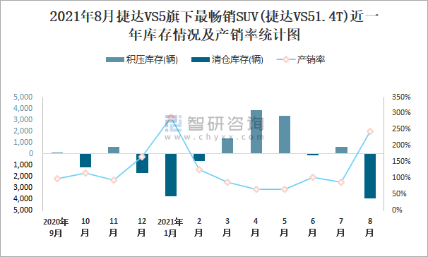 2021年8月捷達VS5旗下最暢銷SUV(捷達VS51.4T)近一年庫存情況及產銷率統計圖