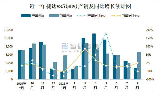 近一年捷達VS5(SUV)產銷及同比增長統計圖