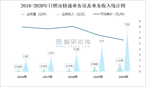 2016-2020年日照市快遞業務量及業務收入統計圖