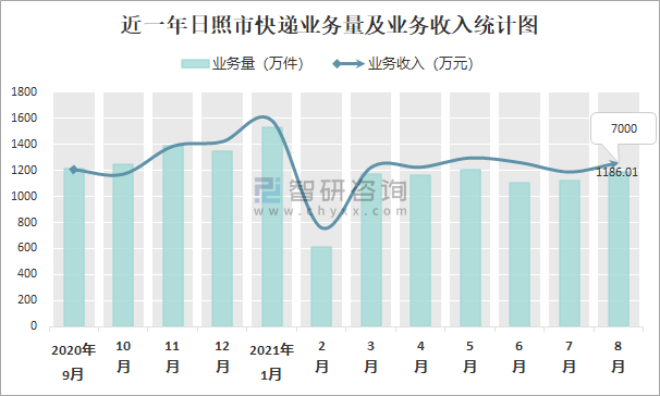 2021年8月日照市快遞業務量與業務收入分別為1186.01萬件和7000萬元