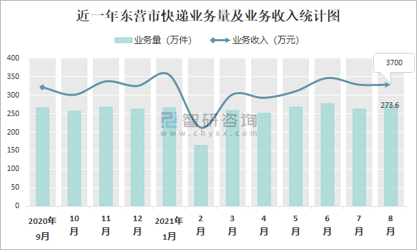 2021年8月東營市快遞業務量與業務收入分別為273.6萬件和3700萬元