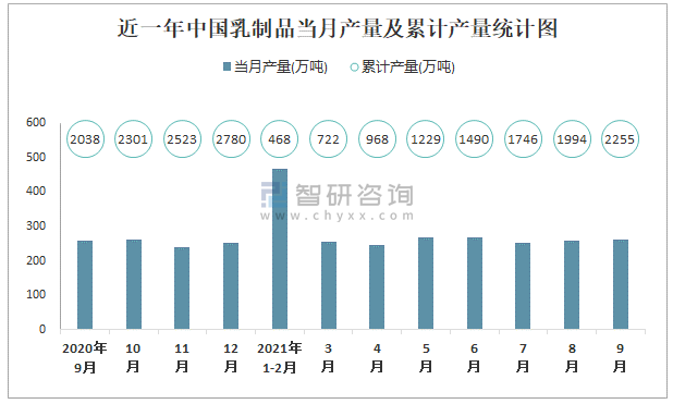 根據國家統計局數據顯示:2021年9月中國乳制品產量為262萬噸,同比增長1%;2021年1-9月中國乳制品累計產量為2254.5萬噸,累計增長10.3%;2015-2020年中國乳制品產量2018年跌至最低,此后逐年遞增。