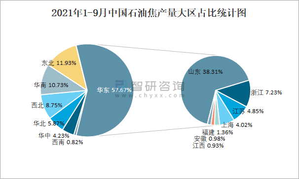 根據國家統計局數據顯示:2021年各季度中國石油焦主要集中在華東、東北、華南地區生產;2021年1-9月中國石油焦產量大區分布不均衡,其中華東地區產量最高,特別是山東省貢獻了最多產量;2021年1-9月中國石油焦各省市產量top1遙遙領先于其他前9名。