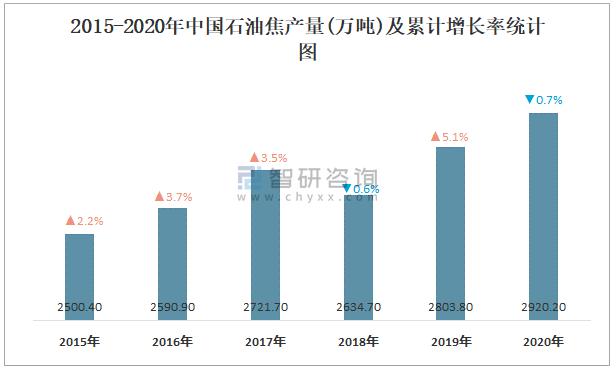 2015-2020年中國石油焦產量及累計增長率統計圖