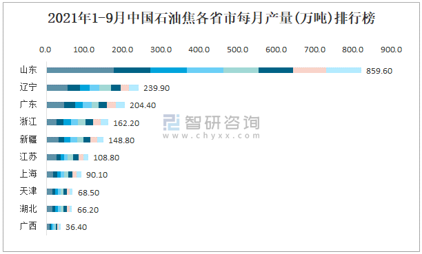 2021年1-9月中國石油焦各省市每月產量排行榜