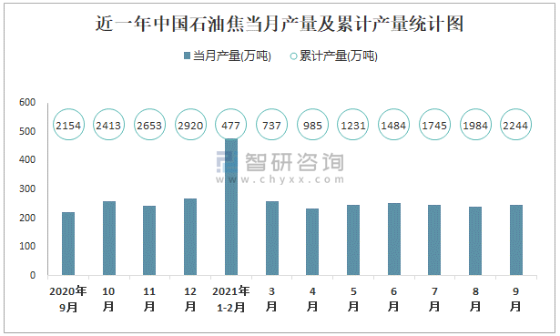 根據國家統計局數據顯示:2021年9月中國石油焦產量為247萬噸,同比增長9.6%;2021年1-9月中國石油焦累計產量為2243.7萬噸,累計增長3.6%;2015-2020年中國石油焦產量2018年起逐年遞增,2020年達到最高。