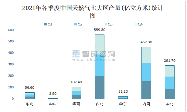 2021年各季度中國天然氣七大區產量統計圖
