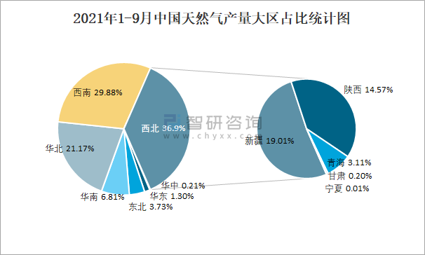 2021年1-9月中國天然氣產量大區占比統計圖