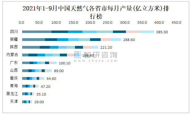 2021年1-9月中國天然氣各省市每月產量排行榜