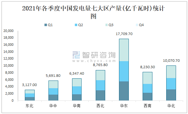 2021年各季度中國發電量七大區產量統計圖