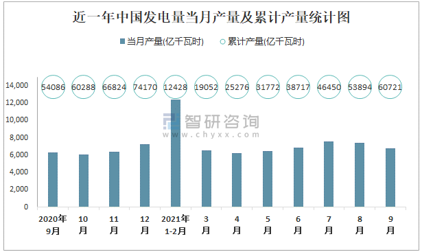 近一年中國發電量當月產量及累計產量統計圖