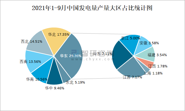2021年1-9月中國發電量產量大區占比統計圖