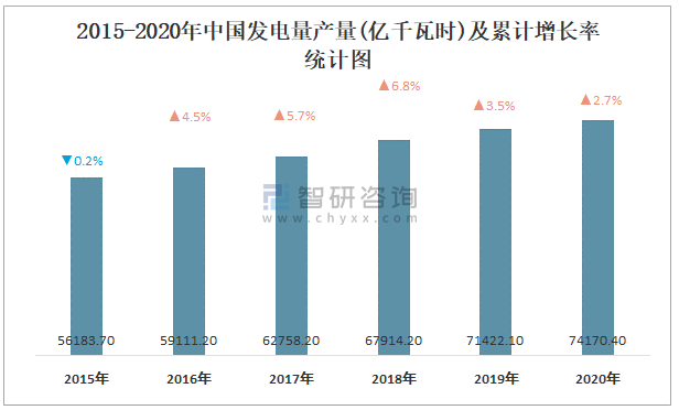 2015-2020年中國發電量產量及累計增長率統計圖