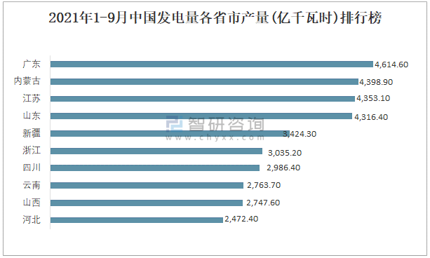 2021年1-9月中國發電量各省市產量排行榜