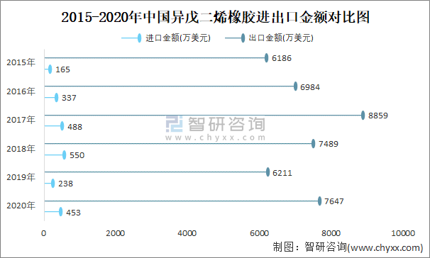 2015-2020年中國異戊二烯橡膠進(jìn)出口金額對(duì)比統(tǒng)計(jì)圖