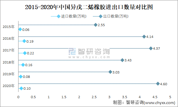 2015-2020年中國異戊二烯橡膠進(jìn)出口數(shù)量對(duì)比統(tǒng)計(jì)圖