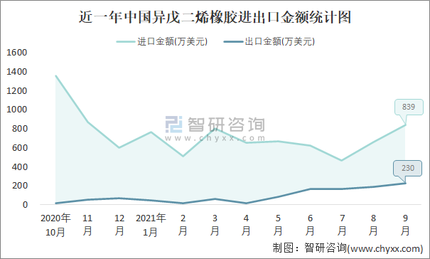根據(jù)中國海關(guān)數(shù)據(jù)顯示:2021年9月中國異戊二烯橡膠進(jìn)口數(shù)量為0.4萬噸,出口數(shù)量為0.1萬噸;進(jìn)口金額為839萬美元,出口金額為230萬美元;近一年中國異戊二烯橡膠出口總金額小于進(jìn)口總金額,貿(mào)易逆差為主,進(jìn)口均價(jià)2098美元/噸。