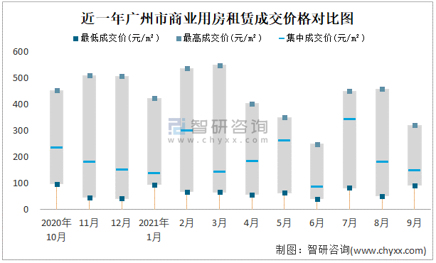 2021年9月廣州市房屋租賃市場價格走勢:商業用房租賃價格在92.46元/㎡-320.23元/㎡之間,集中成交價約為145.94元/㎡