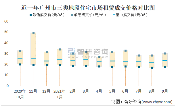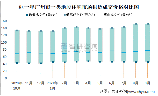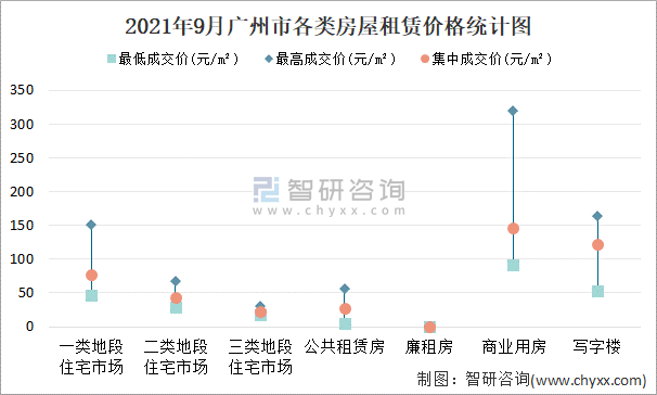根據國信房地產信息網數據可知:2021年9月廣州市7類房屋中,廉租房無統計數據,公共租賃房租賃集中成交價為27.86元/㎡;商業用房租賃最低成交價、最高成交價、集中成交價均高于其他類房屋價格;三類地段住宅市場租賃集中成交價約為23.04元/㎡。