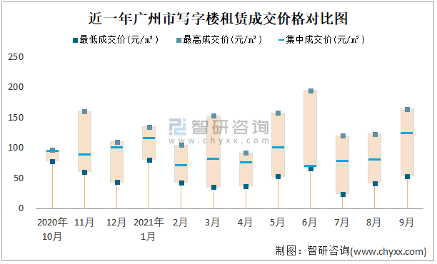 根據國信房地產信息網數據可知:近一年廣州市商業用房租賃集中成交價在84.21元/㎡-340.26元/㎡之間波動,9月集中成交價為145.94元/㎡;寫字樓租賃集中成交價今年9月達到最高值(122.59元/㎡)。
