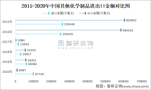 2015-2020年中國其他化學制品進出口金額對比統計圖