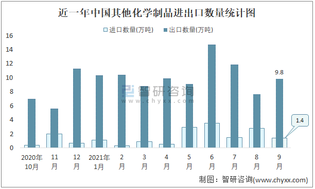 2021年9月中國其他化學制品進出口數量分別為1.4萬噸和9.8萬噸