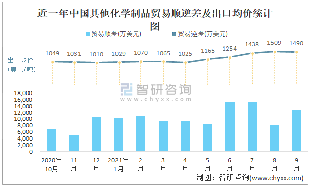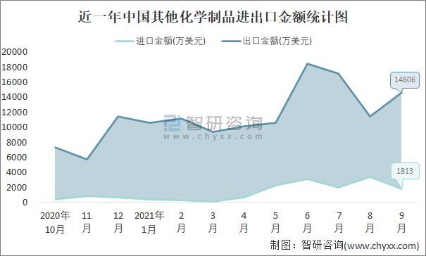 根據中國石油和化學工業聯合會數據顯示:2021年9月中國其他化學制品進口數量為1.4萬噸,出口數量為9.8萬噸;進口金額為1813萬美元,出口金額為14606萬美元;近一年中國其他化學制品出口總金額大于進口總金額,貿易順差為主,出口均價1490美元/噸。