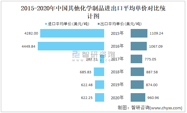 2015-2020年中國其他化學制品進出口平均單價對比統計圖